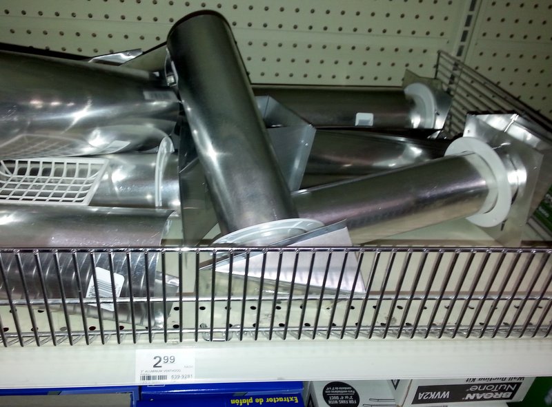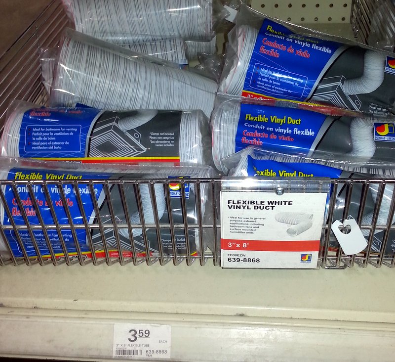 - 3″ Flexible White Vinyl Duct. (Your best bet is a local store. You can buy it online, but it will cost 3 times what it should) Menards and Lows will both have it for under $4 [Expected Price $3.59]