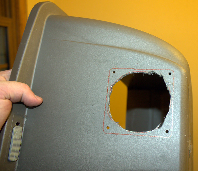 - Put the protective guard on the inside of the cat box. If the holes you drilled in your cat box were close to the size of the screws you will be able to screw the guard onto the cat box. Screw all four screw in to the fan guard. Let the screw be flush with the plastic on the outside. (Makes life easy when you go to screw the fan on)