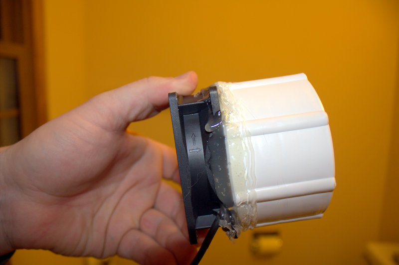 - Hot glue your Duct Coupler to your PC fan. (Note arrows of spin and air flow in photo below)