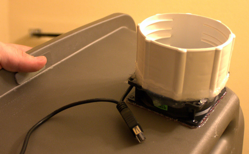 - For added strength and smell suppression hot glue the fan to the cat box.